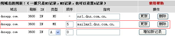 | 邮件交换记录,用于将以该域名结尾的电子邮件指向对应的邮件服务器进行处理。例如:用户的域名为dnsepp.com,所用的邮件也是以该域名作为结尾,那么则需要在MYDNS界面中添加该域名的MX记录来处理所有以@dnsepp.com结尾的邮件。 1、如何添加MX记录? 进入MYDNS界面,在“纯域名的列表”栏目中进行设置  在类型处选择MX,顺序处填写5-99之间的数字,数字越小代表优先级越高,一般填写为5,在指向处填写邮件服务器的地址,地址可以是ip地址如:124.42.122.128,或主机名+域名,如:mailmx.dns.com.cn 注:增加MX记录时,需要在主机名+域名的最后一个加一个“.” 填写好后点击“增加新纪录”按钮即可 2、如何修改MX记录?  直接在已有的MX记录后面的指向处将原有的地址改写为新的并点击“更新”按钮即可。 3、如何删除MX记录? 点击要删除的MX记录后面对应的“删除”按钮即可。 注:凡是使用新网互联公司提供的邮件服务的用户我们的系统已经将此项记录自动设置好,请千万不要随意修改或删除,否则会影响您的邮件的正常收发。 |