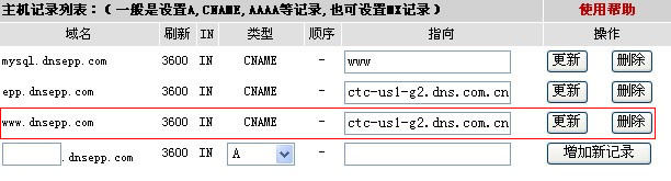 | 通常称别名指向。在这里,您可以定义一个主机别名,比如设置www.dnsepp.com,用来指向一个主机ctc-us1-g2.dns.com.cn那么以后就可以用www.dnsepp.com来代替访问ctc-us1-g2.dns.com.cn了。 1、如何添加CNAME记录 进入MYDNS界面,在“主机记录列表”栏目中进行设置  在域名处填写www,类型选择为CNAME,顺序处不必填写保持默认值,指向处填写目标地址,如:ctc-us1-g2.dns.com.cn. 注:在指向处,只能填写完整的域名且在最后要加一个“.”如:ctc-us1-g2.dns.com.cn.而不能是ip地址或网站下面的某个目录。 2、如何修改CNAME记录  直接在已有的CNAME记录后面的指向处将原有的地址改写为新的并点击“更新”按钮即可。 3、如何删除CNAME记录 点击要删除的CNAME记录后面对应的“删除”按钮即可。 |